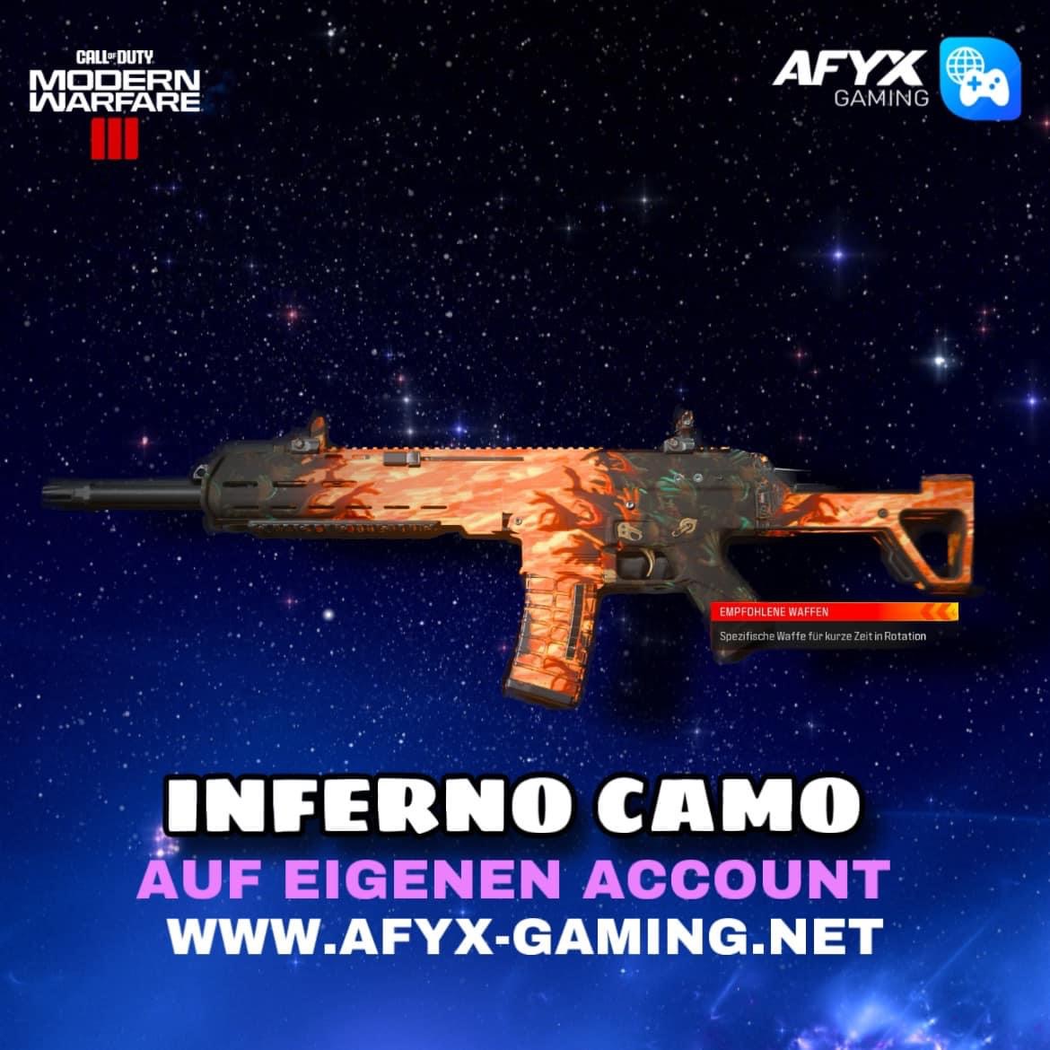 Jetzt CoD MW3 / Warzone 3 Inferno Tarnung freischalten lassen. Für Alle Waffen.